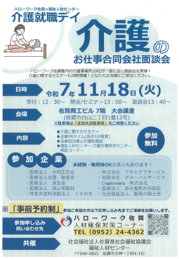 | 11/18 | 介護就職デイ 介護のお仕事合同会社面談会 | 佐賀商工ビル(佐賀市) |