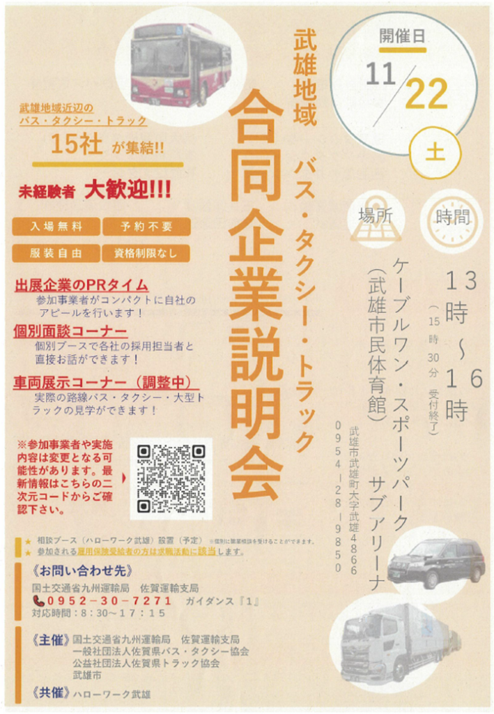| 11/22 | 武雄地域バス・タクシー・トラック合同企業説明会 | ケーブルワン・スポーツパーク(武雄市) |