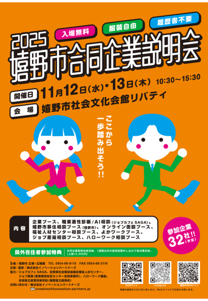 | 備考 | ○参加無料 ○服装自由 【サポートブース】 ●相談コーナー ●職業適性診断・AI相談コーナー ●佐賀県情報コーナー 【同日開催!学びフェス(ミニ)】 |