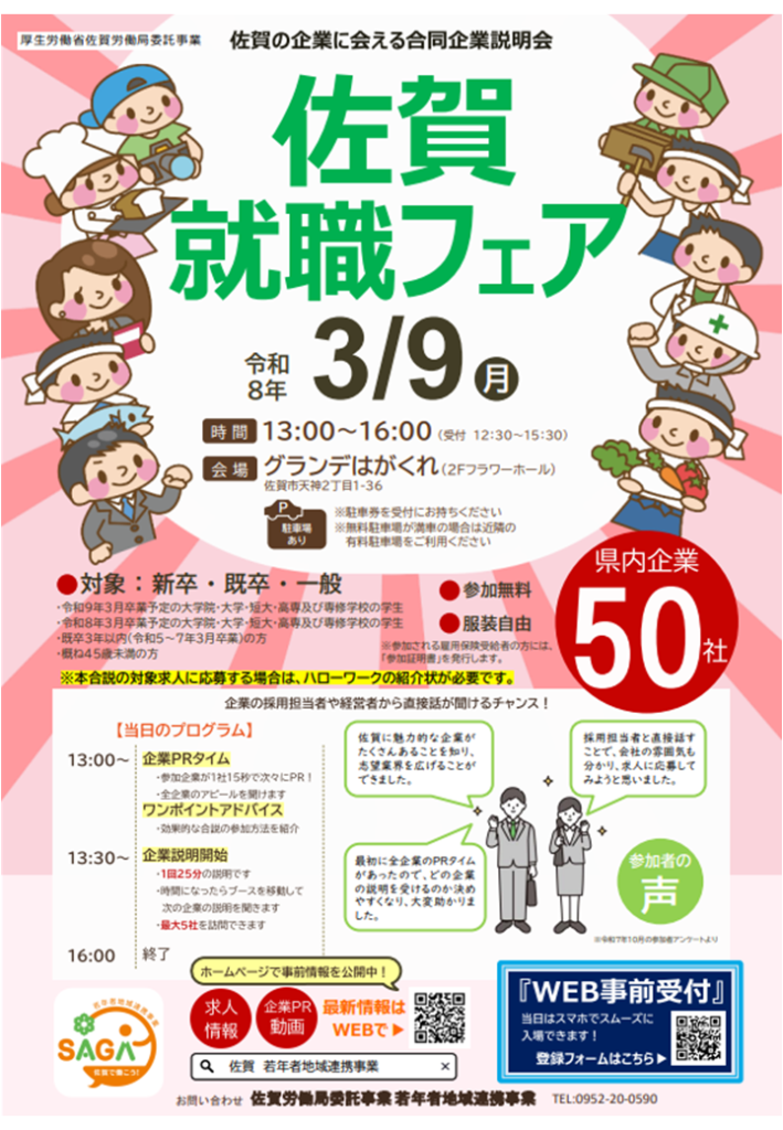 | 備考 | 参加無料・服装自由 【サポートブース】 ・相談コーナー(ハローワーク/ヤングハローワークSAGA) ・職業適性診断 ・AI相談コーナー(ジョブカフェSAGA) ・佐賀県情報コーナー(佐賀県産業人材課/産業技術学院) |