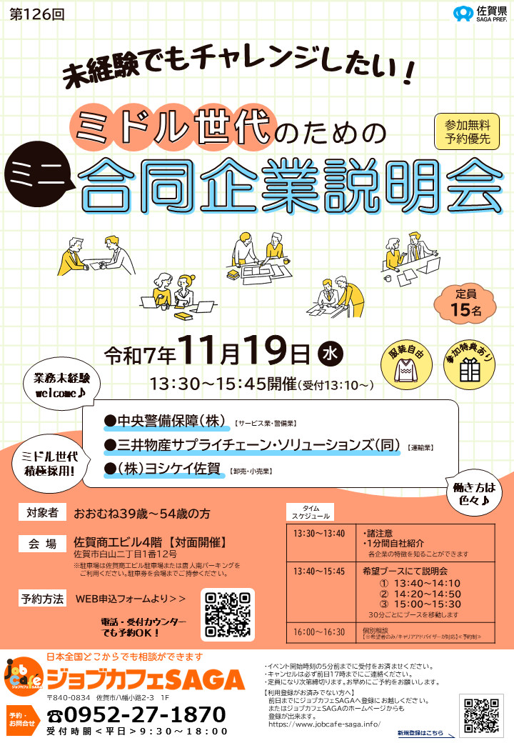 | 11/19 | 未経験でもチャレンジしたい!ミドル世代のためのミニ合同企業説明会 | 佐賀商工ビル(佐賀市) |