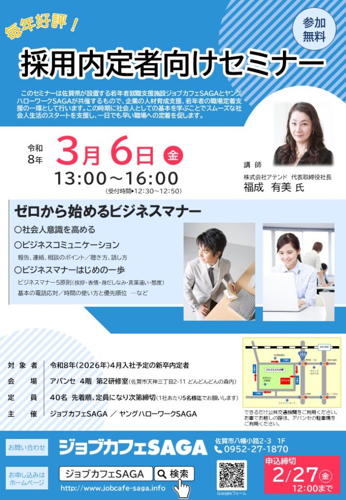 ●主催 ジョブカフェSAGA お問い合わせTEL:0952-27-1870 (受付時間 平日 9:30~18:00) ※12/29~1/3は閉館いたします。 |