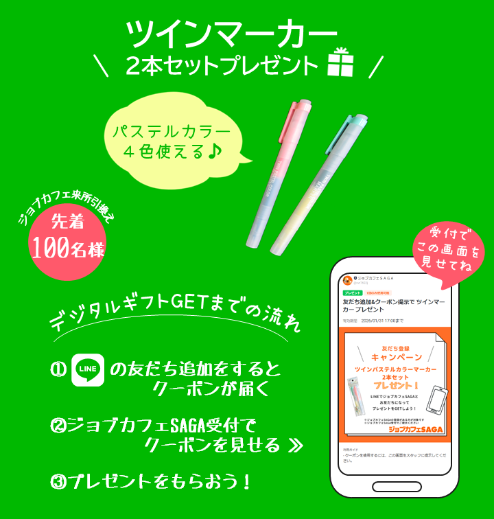 ※クーポンを取得しただけではプレゼントを受け取ることはできません。必ずジョブカフェSAGAへ来所し、受付で提示してください。(受付でクーポンを提示した先着100名様に、ツインマーカー2本セットをプレゼントします)