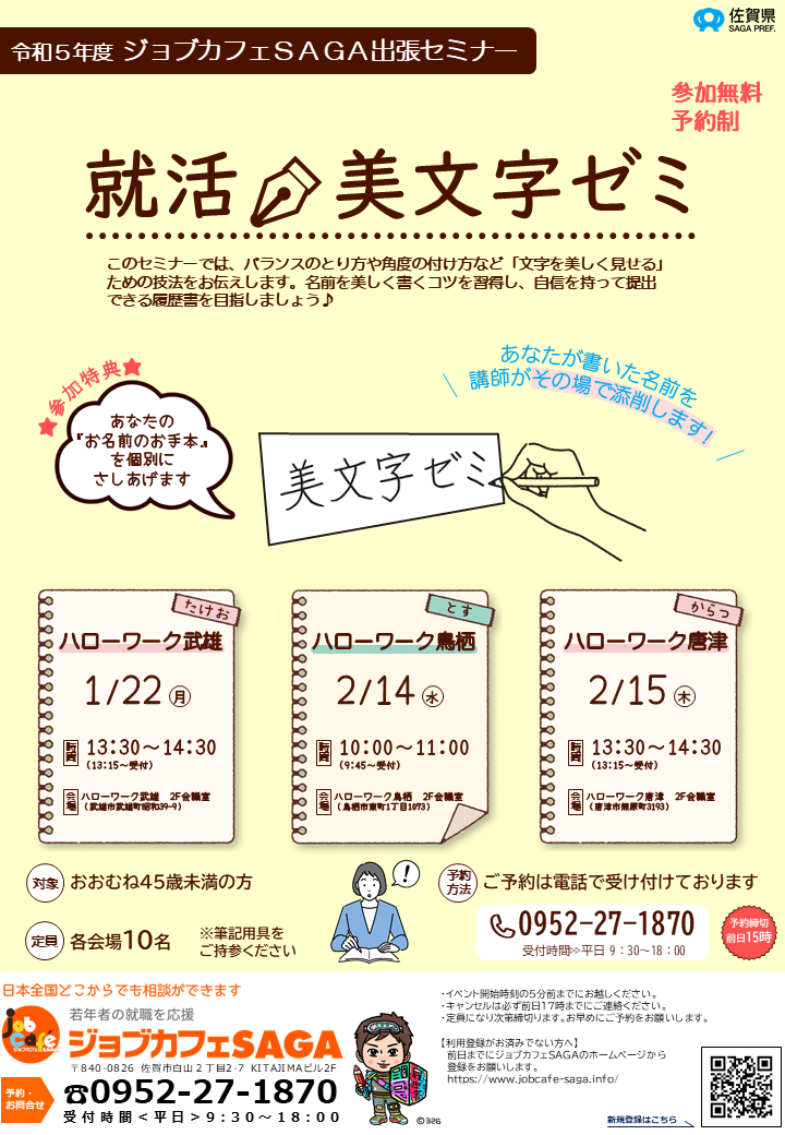 ■電話予約(未登録の方や登録名に変更がある方は、予約の際にお名前の漢字をお伝えください) ジョブカフェSAGA ☎0952-27-1870(平日9:30~18:00) お申し込み締切:開催日の前日15時まで |